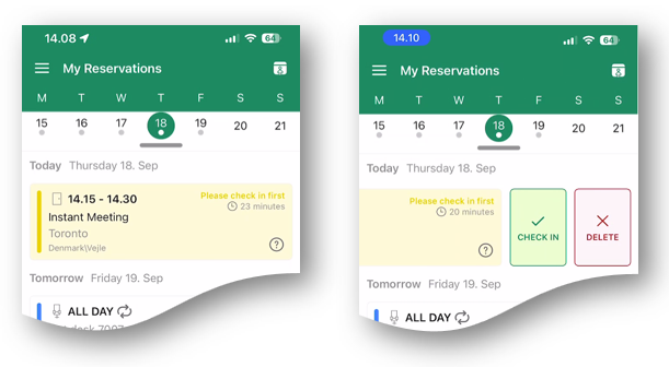 The check-in functionality can be configured for each resource, providing flexibility. In the Workspace app, the Check-in feature is available in the My Reservations view. Users can complete the check-in by swiping to the right.