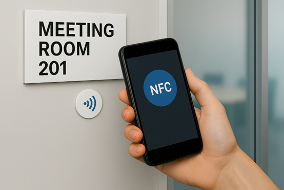 NFC tags are available in many different formats and appearances, making them easy to integrate on walls or doors for meeting rooms, or even on desks. Search on the internet for NFC tag stickers to find a lot of different NFC tags that can be used
