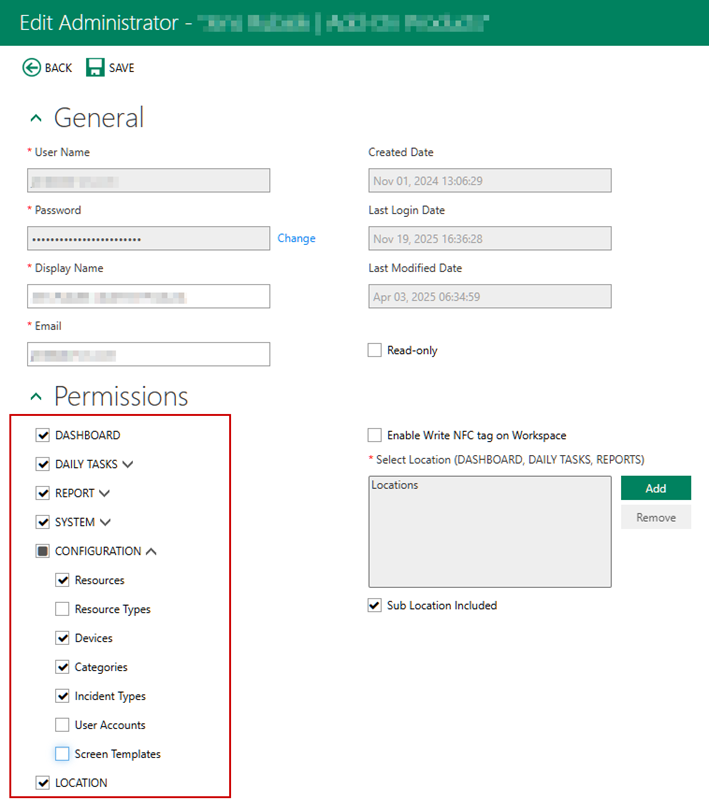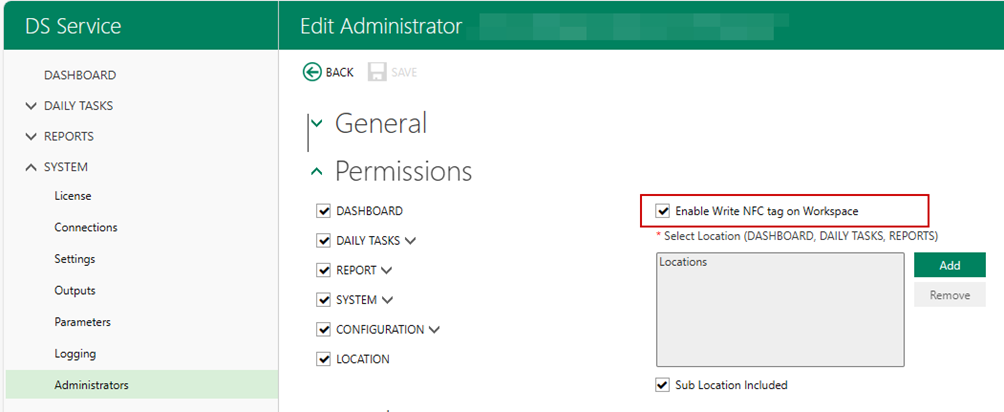 Under the SYSTEM menu, Administrator, you give an administrator permission to “write” NFC tags, using this Workspace app, Enable Write NFC tag on Workspace