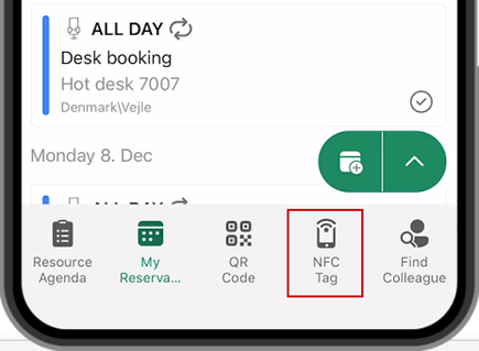 When a user tap on NFC Tag function, the NFC reader will activate and quickly read the associated resources. It will then be ready to either make a new reservation or perform check-in, depending on the current situation. In general, reading an NFC tag operates similarly to scanning a QR code; however, NFC tags typically offer enhanced security due to their greater resistance to duplication and reproduction compared to QR codes.