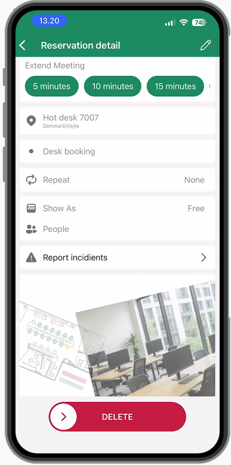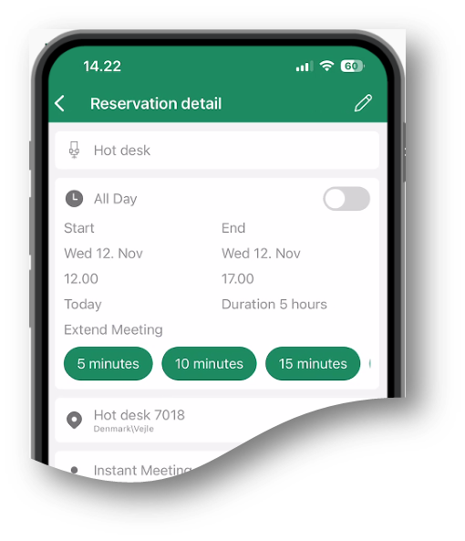 To quickly extend a current reservation in the Workspace app, open your booking and select one of the options to extend the reservation if you need more time, such as during a meeting. The available extension times are set in Workspace Settings under Date and Time > Time Steps (minutes) and are only offered if no other reservations conflict.