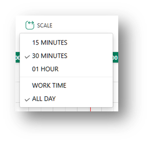 A new SCALE function has also been introduced, enabling users to display either WORK TIME or ALL DAY views according to their needs. Furthermore, you can now adjust the time scale between 15, 30, or 60-minute intervals, allowing for greater flexibility and customization in how your schedule is visualized and managed.