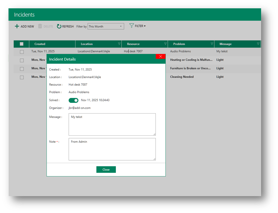 The incident management system now allows incidents to be assigned directly to specific administrators based on both location and incident type. Incident can be added to the system from either the Workspace Booking App or the Digital Sign Client – door sign mode.