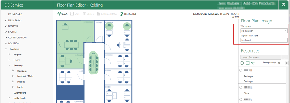 The floor map can be rotated to suit different needs. In some cases, rotating the floor map image for Workspace or Digital Sign Client is helpful, as screen orientation may vary.