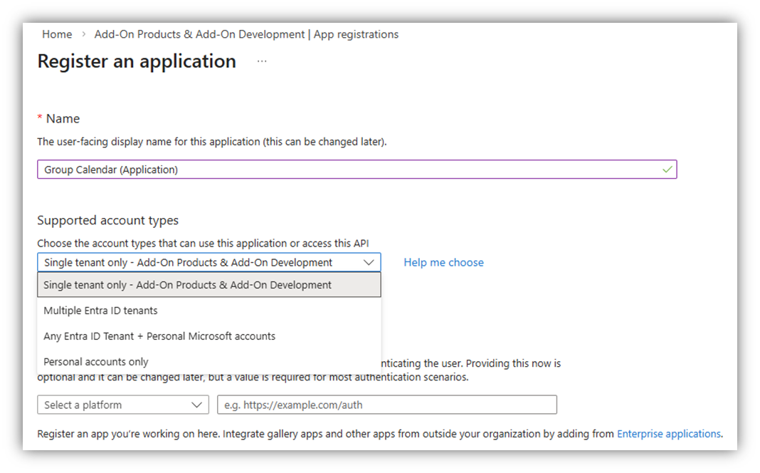 Enter the application Name and select ‘Single tenant only - …’ in Supported account types section.