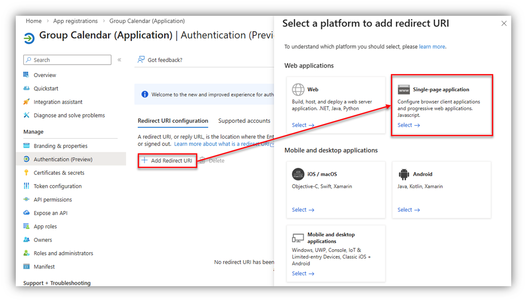 Next, click on [Authentication (Preview)] section, as in the bellow figure, click [Add Redirect URI], a right panel of Select a platform will appear: