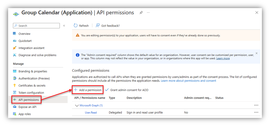 On your Azure app, go to API permissions then click [Add a permission]:
