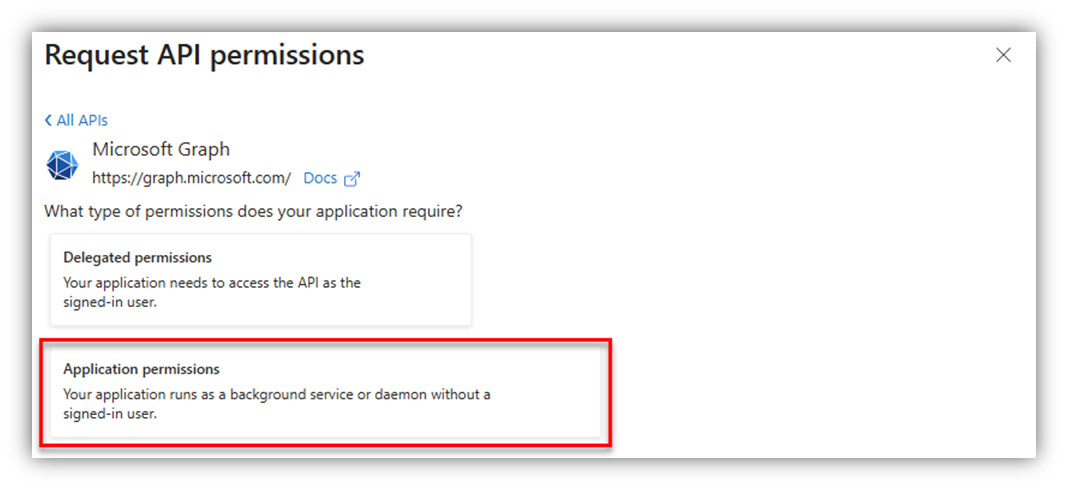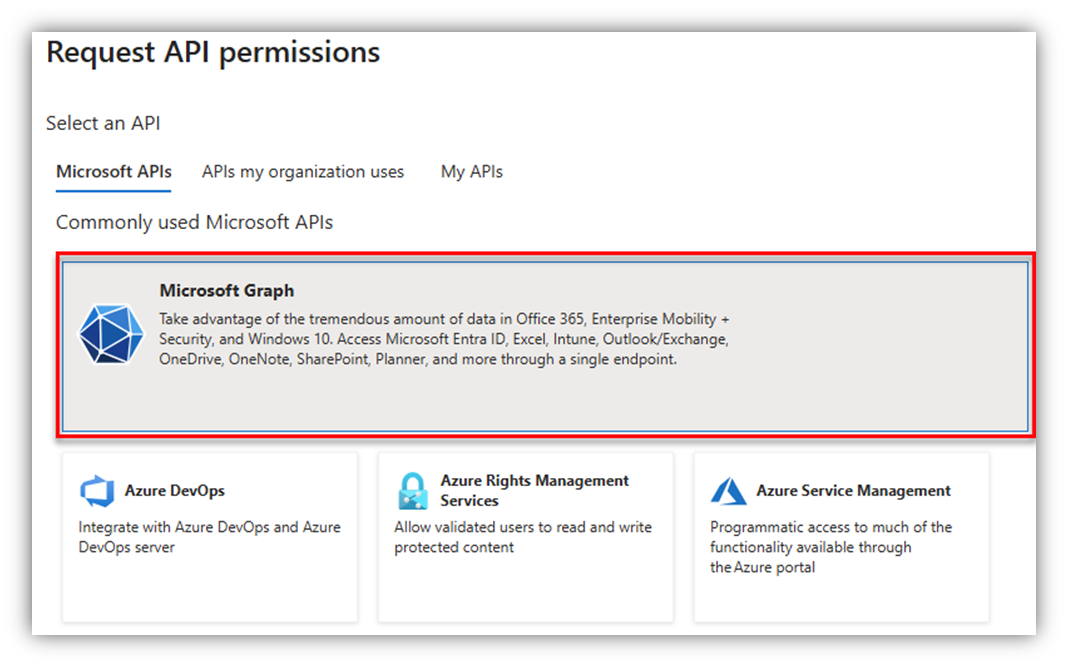 After that, the Request API permissions screen will appear, in which you select Microsoft APIs ® Microsoft Graph ® Application permissions:
