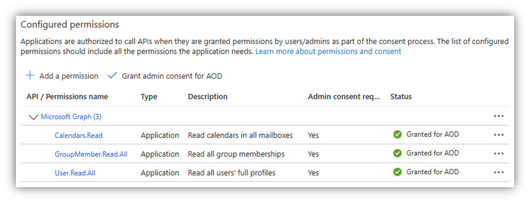 Once you are done, click [Grant admin consent for …] to apply the added permissions. The result should look similar as follows: