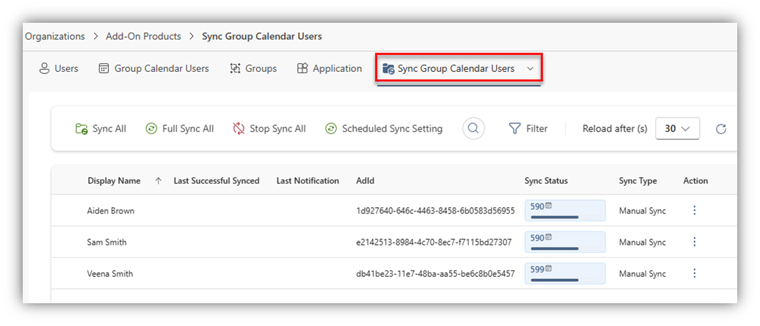 Note: It is recommended to enable Push Notification to establish real-time synchronization with Exchange Online. This feature is automatically activated for each user after a successful full synchronization from Azure AD or Exchange Online to the organization. It can be accessed from the Sync Group Calendar Users tab by selecting the Action button for each user.