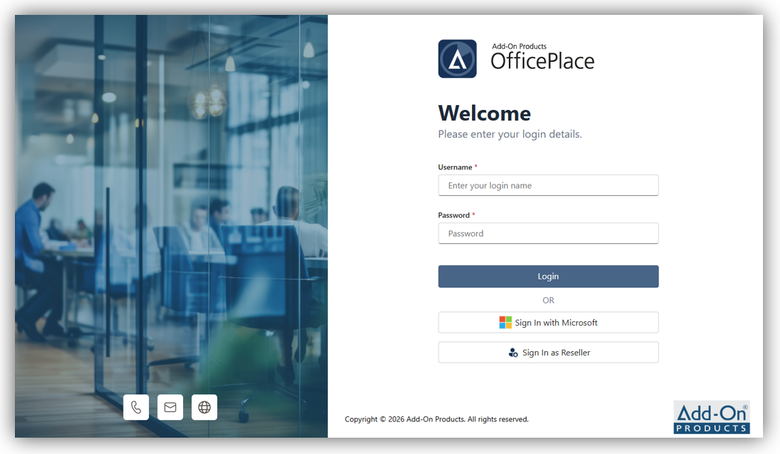 Begin by launching your web browser and entering the URL of the web server hosting OfficePlace in the address bar: https://admin.officeplace.global/