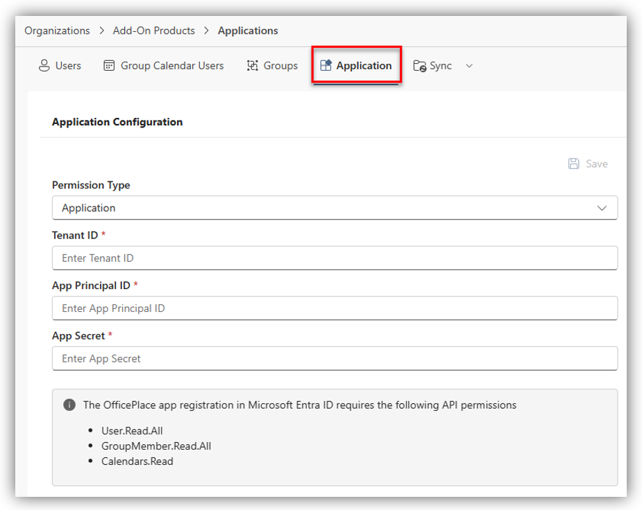In your organization, you can configure settings to enable the connection to Azure AD / Exchange Online data for resources and users under the Application tab. The application configurations are necessary to sync data between the Organization and Azure AD / Exchange Online.