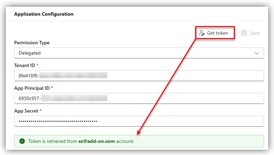 Once the account is authenticated and authorized, a message will display confirming that the token has been successfully retrieved from that account. Click [Save] to save the configuration.