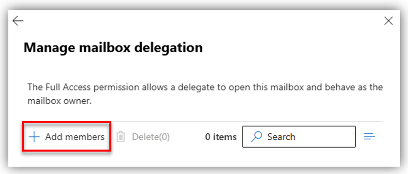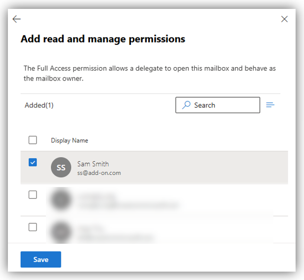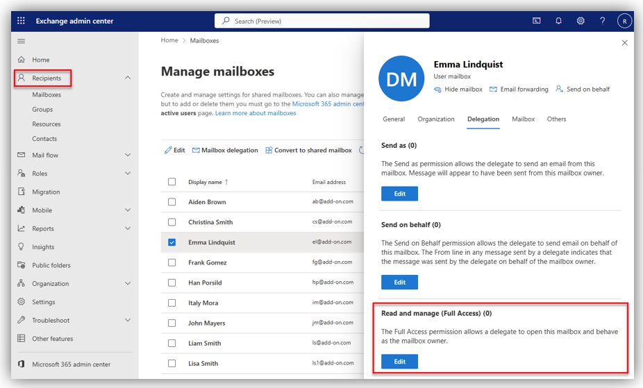 - Select each recipient individually to assign permissions. In the details panel, open the Delegation tab. Three permission options are displayed, but for the service account, only Read and Manage (Full Access) is required. E.g.: