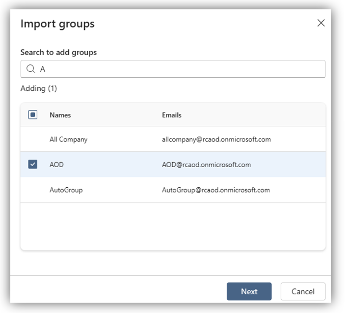 Here, you can enter their information in the search bar to find groups within your Azure AD or Exchange Online tenant. Click [Next] and the confirmation screen will appear.