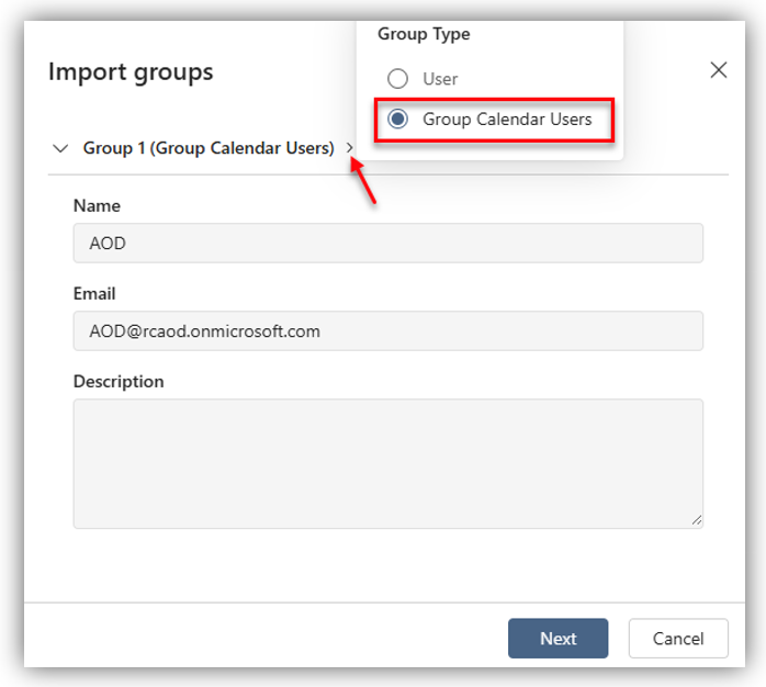 You can select the group type = ‘Group Calendar Users’ of the group by clicking the small arrow beside the group’s name. Click [Next] to finish.