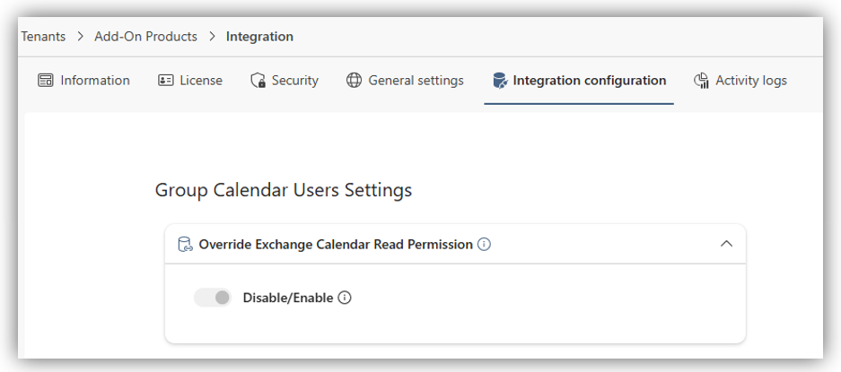 On the Integration configuration tab, you can see whether the Override Exchange Calendar Read Permission setting is enabled or not. Note that you cannot enable or disable this setting.
